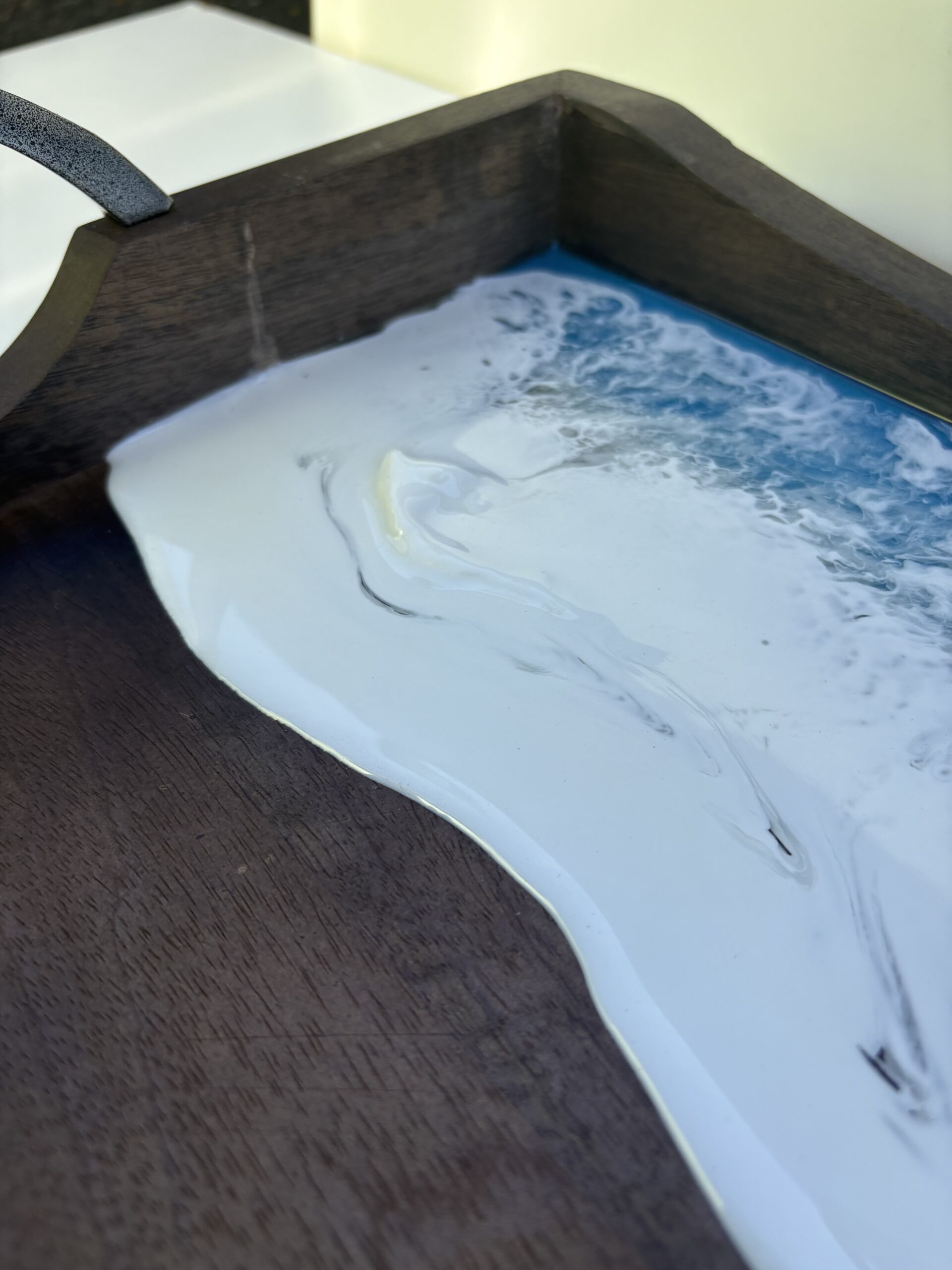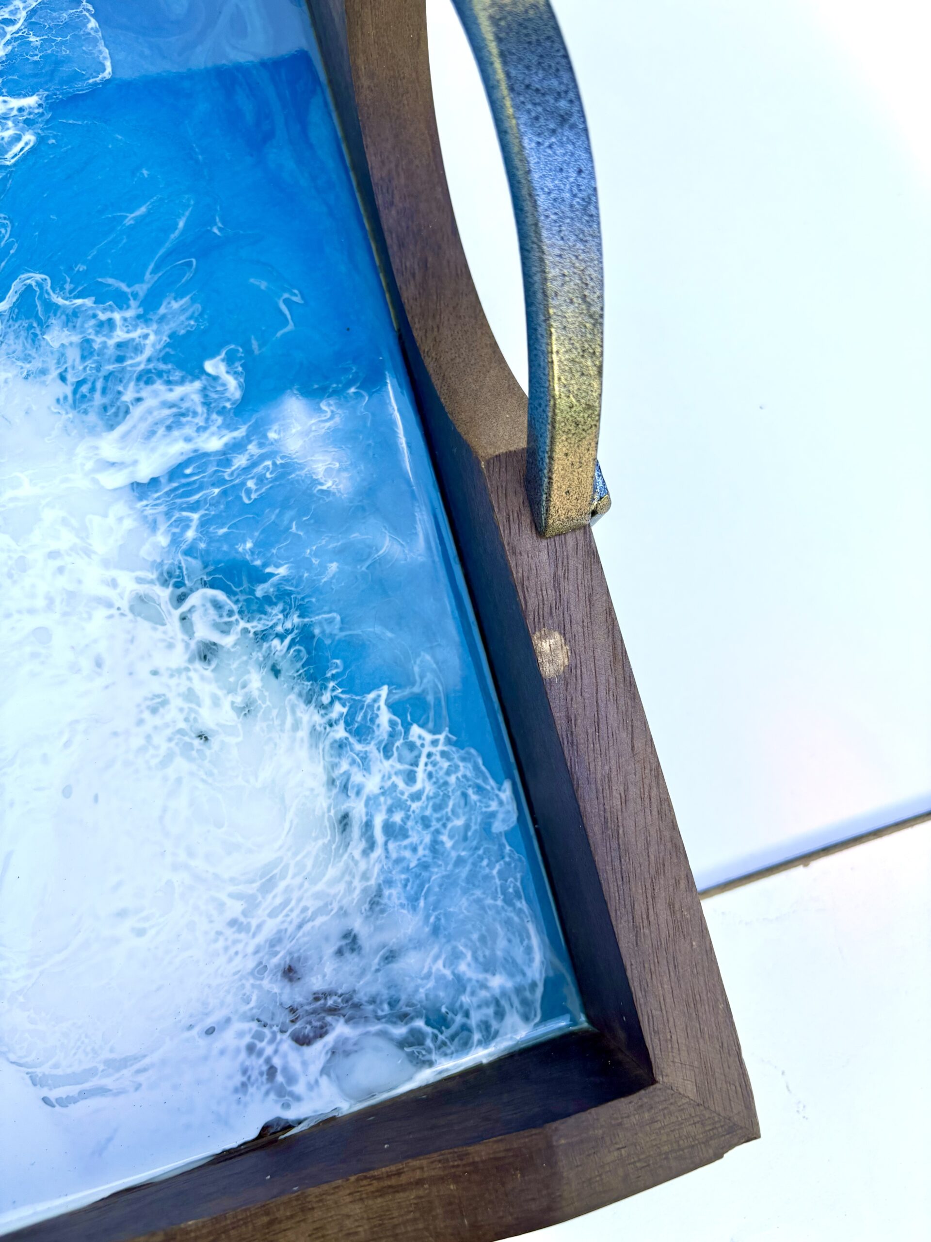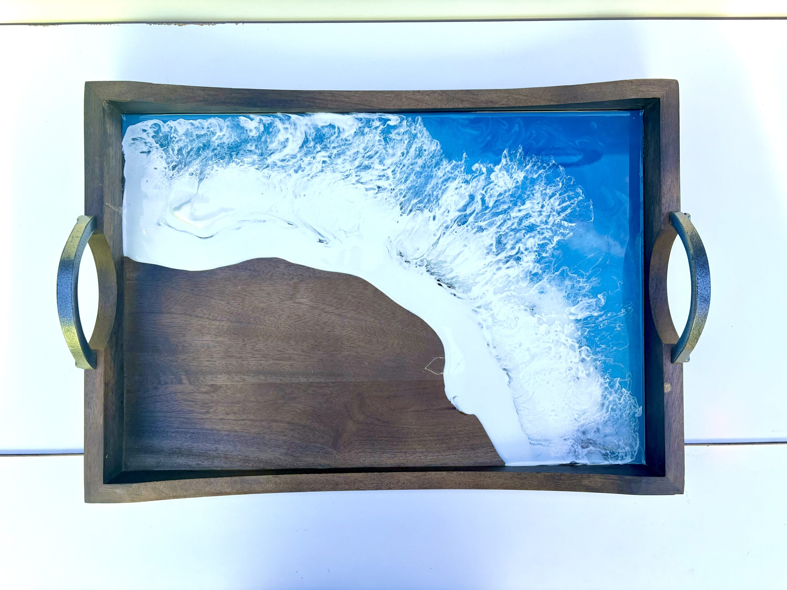 Dark wood tray with gun metal handles measuring 20″x14″x2.” Reduced price due to some mess ups that can be viewed in the image gallery.